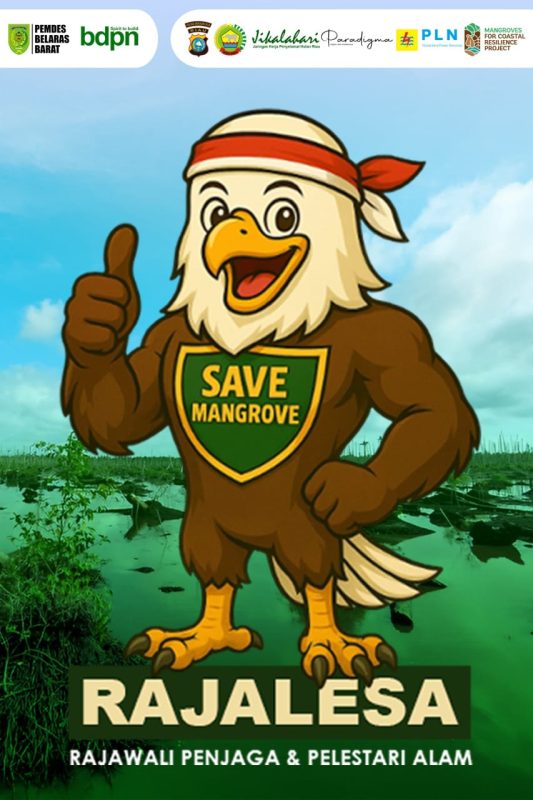 Maskot RAJALESA diperkenalkan sebagai media kampanye kreatif dan edukatif untuk anak-anak. Rajawali gagah dengan ikat kepala merah putih dan perisai “Save Mangrove” ini menjadi inspirasi di setiap sesi menggambar, membaca cerita, dan simulasi penyelamatan lingkungan.